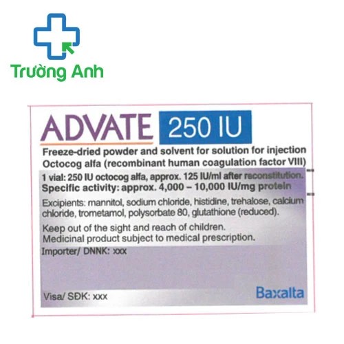 - Advate 250IU là thuốc được chỉ định điều trị và dự phòng xuất huyết ở bệnh nhân bị bệnh Hemophilia nhóm A (thiếu yếu tố bẩm sinh VIII) hiệu quả, thuốc được sản xuất bởi Baxalta Manufacturing Sàrl (Thụy Sĩ).