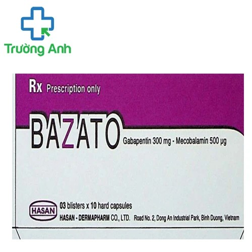 - Bazato là thuốc được dùng điều trị các triệu chứng đau thần kinh ở người lớn bao gồm đau thần kinh ngoại biên, đau dây thần kinh sinh ba, đau thần kinh ở bệnh nhân đái tháo đường. Bazato là sản phẩm được sản xuất bởi công ty TNHH Hasan-Dermapharm.