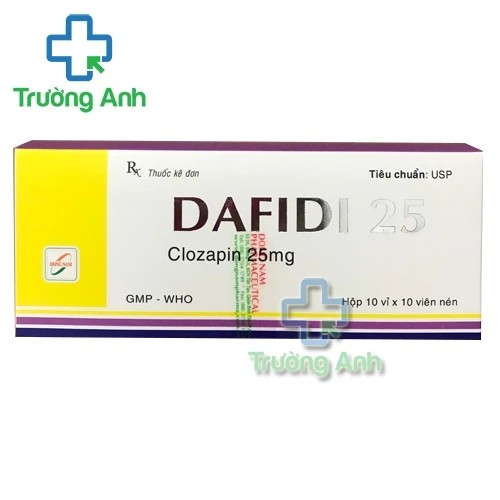 - Dafidi 25 là thuốc được sử dụng trong điều trị tâm thần phân liệt kháng trị, rối loạn tâm thần trong suốt quá trình của bệnh Parkinson hiệu quả. Dafidi 25 là sản phẩm được sản xuất bởi Công ty cổ phần sản xuất - thương mại Dược phẩm Đông Nam.