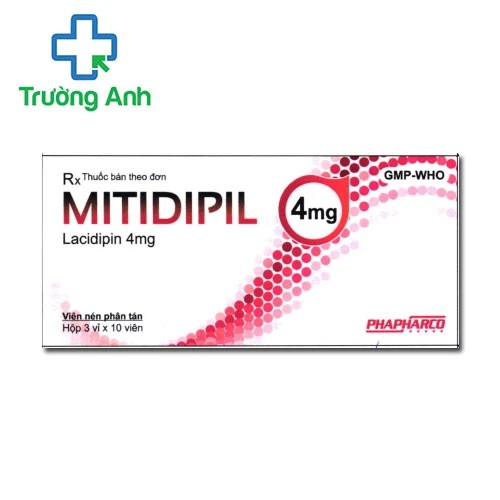 - MITIDIPIL 4MG được chỉ định ở người lớn đề điều trị tăng huyết áp đơn thuần hoặc phối hợp với các thuốc điều trị tăng huyết áp khác như thuốc chẹn kênh bêta, thuốc lợi tiểu và thuốc ức chế ACE.