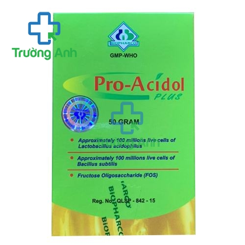 - Thuốc Pro-Acidol Plus (lọ 50g) chứa thành phần chính gồm 2 lợi khuẩn Bacillus subtilis và Lactobacillus acidophilus. Thuốc Pro-Acidol Plus dùng điều trị các trường hợp loạn khuẩn đường tiêu hóa, viêm ruột cấp và mạn tính.