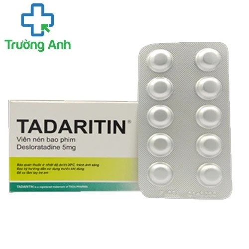 - Tadaritin 5mg là thuốc giúp làm giảm các triệu chứng viêm mũi dị ứng theo mùa hay quanh năm như hắt hơi, sổ mũi, ngứa, nghẹt mũi, kèm kích ứng mắt, chảy nước mắt & đỏ mắt, ngứa họng và ho; giảm các triệu chứng mề đay mạn tính tự phát. Tadaritin 5mg do Công ty Cổ phần Dược phẩm TaDa đăng ký và được sản xuất bởi Laboratorios Lesvi S.L.